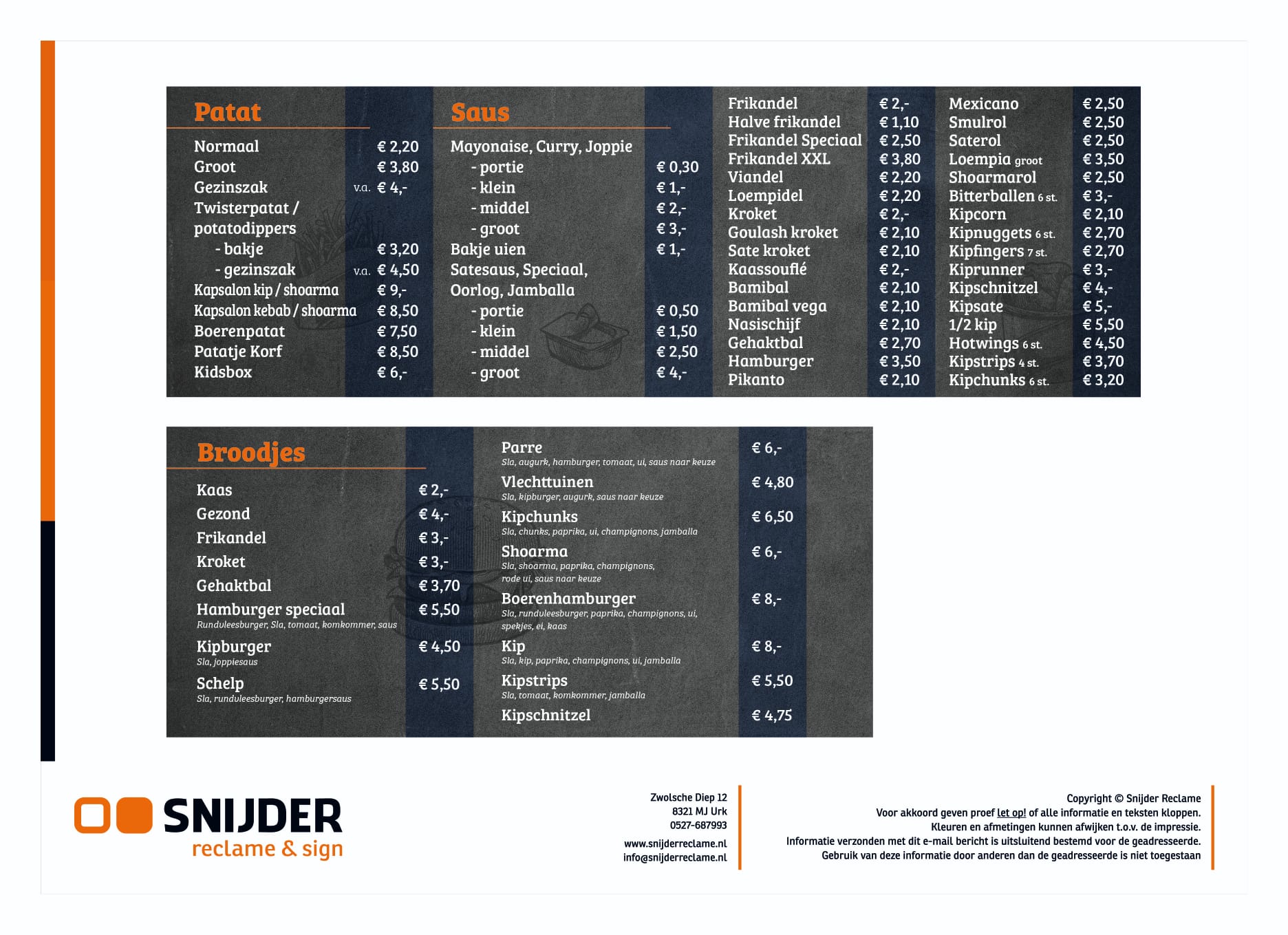 Voor een heerlijk vers patatje oorlog, kroket of toch een frikandel mayo, kunt u onze snackbar bezoeken. Wij hebben regelmatig acties. Bezoek daarom onze website regelmatig.
